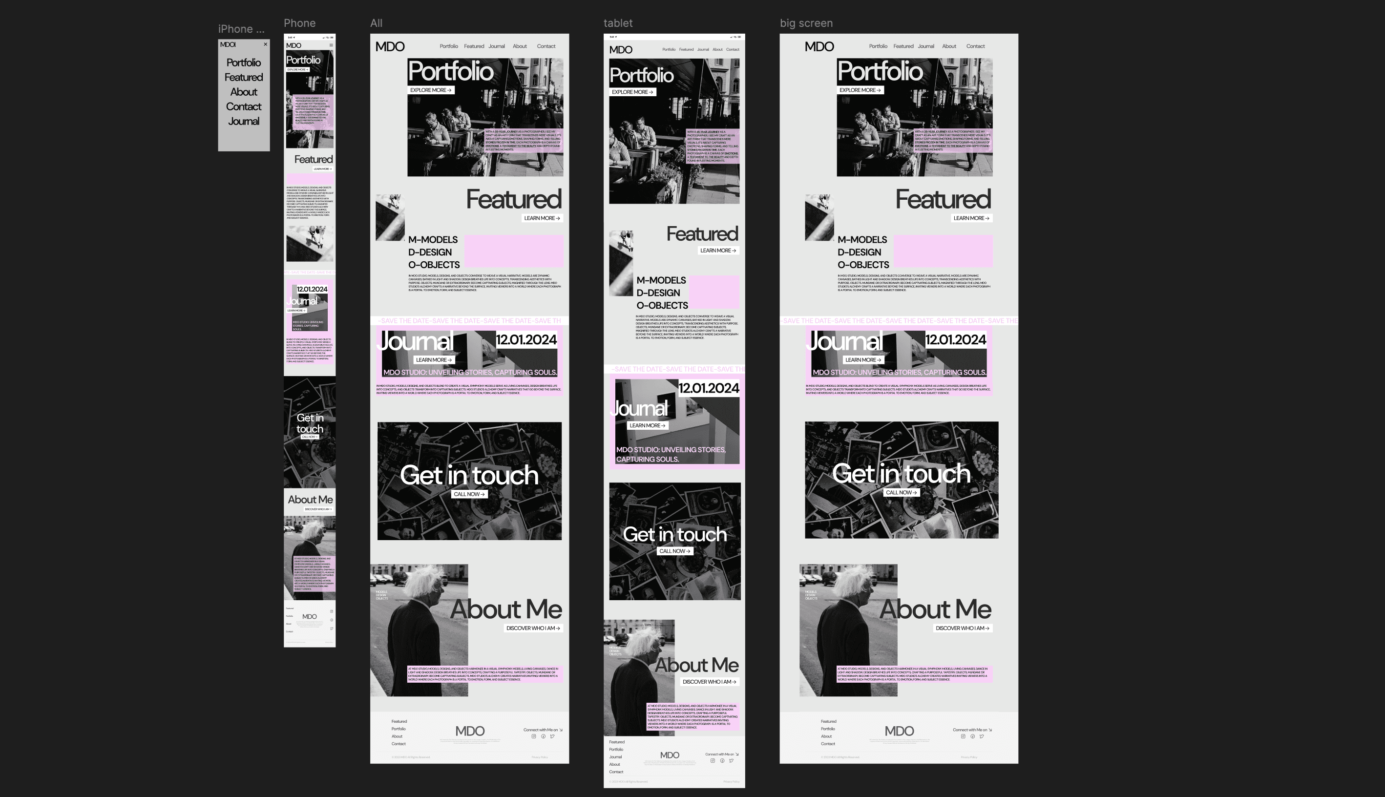 The design is minimalist, much like the photographer's work. The color palette, with its accent of soft pink, is intended to draw attention to the details and highlight "what it’s made of." The overall design is meant to resemble an exhibition—simple to navigate yet captivating, much like the soft pink that "commands you to stop."